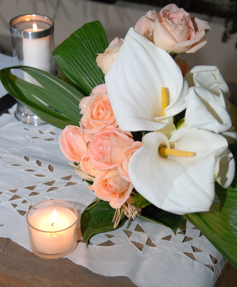 Mesa de doces, bolo e chocolates com peças da família. As tias, mães e avós se orgulharam quando viram a montagem com flores e chocolates.